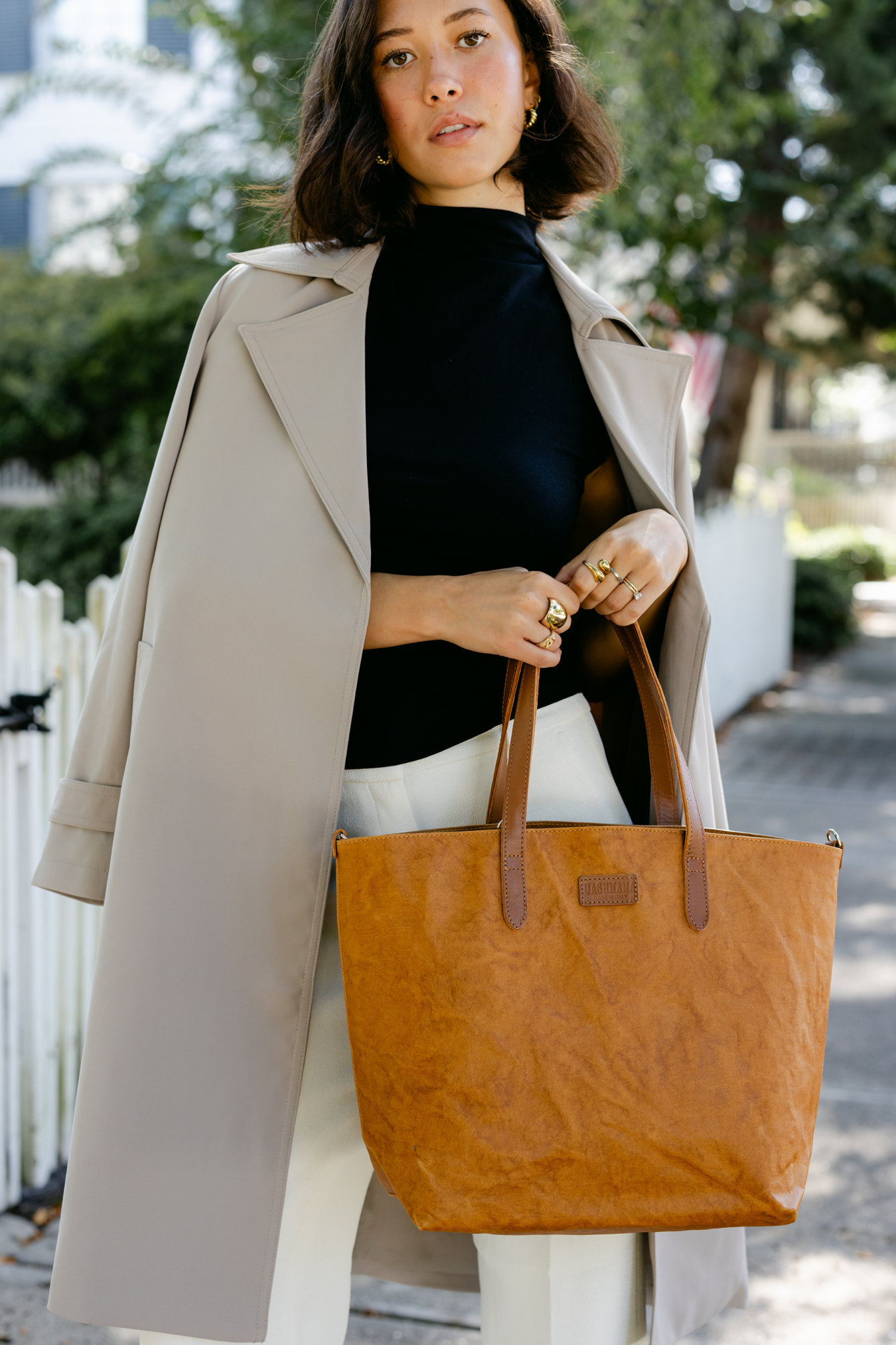Meet the Cami Bag—crafted from water-resistant washable paper with premium Italian leather handles, it’s a chic blend of utility and style. Availab...